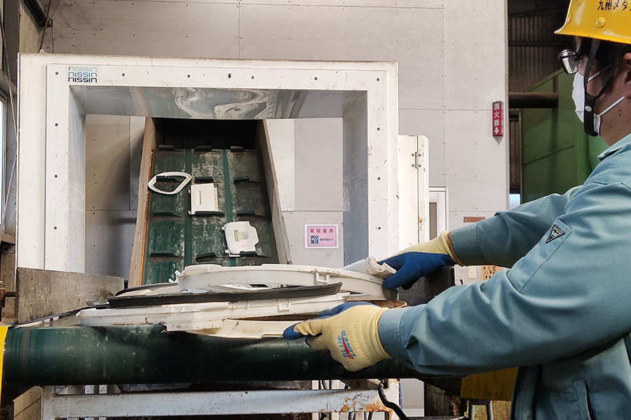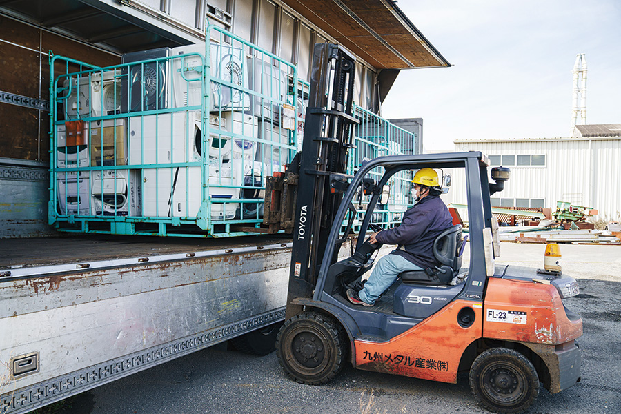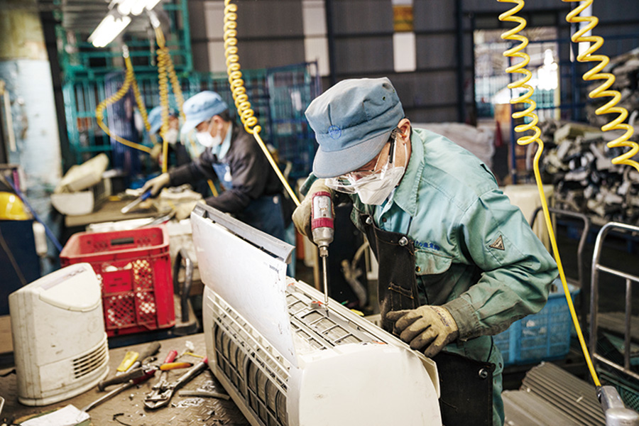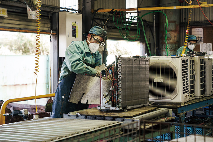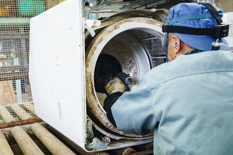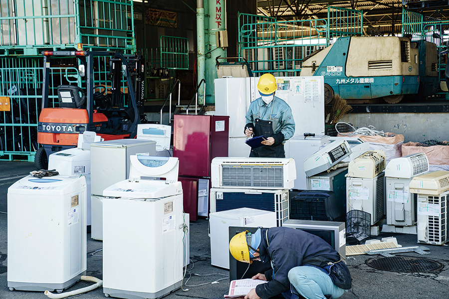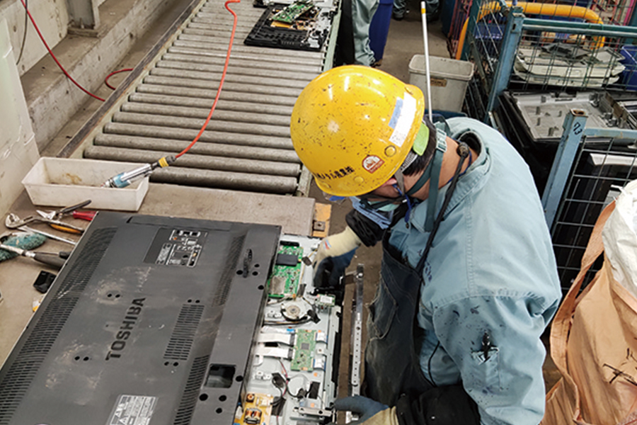2001年、世界に先駆けて「特定家庭用機器再商品化法(家電リサイクル法)」が制定され廃家電4品目のリサイクルが始まりました。 当社では北部九州・山口県の廃家電の引取回収とリサイクル処理業務の一部を担っています。 家電リサイクル業務引取・解体処理・分別作業は手作業の占める割合が高く、大部分が人間の手によって行われます。 またリサイクル付加価値を高めるため、プラスチックリサイクルなどにも積極的に取り組んでいます。