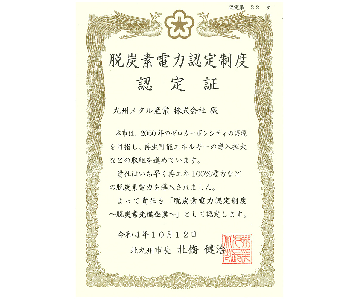 また、10月12日付けで北九州市の『脱炭素電力認定制度』において『脱炭素先進企業』の認定をいただきました。